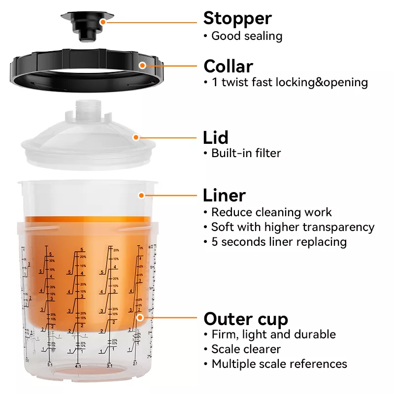 కొత్త ఉత్పత్తి---400ML స్పీడీ పెయింట్ సిస్టమ్ 2.0 ప్రత్యేకంగా Qingdao Aspaint ద్వారా సరఫరా చేయబడింది! మూతపై ఉన్న ప్రత్యేకమైన గైడ్ ఫెన్స్ డిజైన్ నోబ్ మరియు అనుభవజ్ఞులైన స్ప్రే పెయింటర్లను స్ప్రే గన్తో త్వరగా కనెక్ట్ చేయడానికి అనుమతిస్తుంది, ఇది స్ప్రేయింగ్ సామర్థ్యాన్ని గణనీయంగా మెరుగుపరుస్తుంది. స్టెయిన్లెస్ స్టీల్ అడాప్టర్ చాలా తుప్పు-నిరోధకతను కలిగి ఉంటుంది, అంతేకాకుండా కొత్త PP ముడి పదార్థంతో తయారు చేయబడిన ఔటర్ కప్ దృఢంగా మరియు మరింత మన్నికగా ఉంటుంది. ఇంకా, మీ సమగ్ర అనుకూలీకరణ అవసరాలను తీర్చడానికి మాకు ప్రొఫెషనల్ డిజైన్ బృందం ఉంది. Qingdao Aspaint డిస్పోజబుల్ పెయింట్ కప్ సిస్టమ్ రూపకల్పన మరియు అభివృద్ధిపై దృష్టి సారిస్తుంది. స్ప్రే పెయింటింగ్ ఔత్సాహికులు సోషల్ మీడియాలో మాకు సందేశాలు పంపడానికి మేము స్వాగతిస్తున్నాము. పరీక్ష కోసం ఉచిత నమూనాలను అభ్యర్థించడం గుర్తుంచుకోండి!