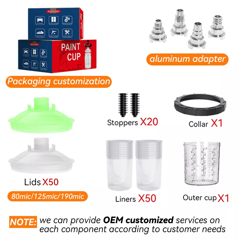 850ML స్పీడీ పెయింట్ సిస్టమ్ 2.0 ప్రధానంగా ఉపయోగించబడుతుంది మరియు ప్రొఫెషనల్ ఆటోమోటివ్ స్ప్రేయింగ్ మరియు ఇండస్ట్రియల్ స్ప్రేయింగ్ స్ప్రే గన్లపై అమర్చబడింది. ప్రాథమికంగా మార్కెట్లోని అన్ని స్ప్రే గన్ బ్రాండ్లను కలవడానికి మేము 20+ రకాల అడాప్టర్లను అందించగలము. ఉత్పత్తికి సంబంధించి, మేము 80, 125 మరియు 190మైక్ ఫిల్టర్లను అందించగలము మరియు లైనర్ మరియు మూత కొన్ని ప్రత్యేకమైన పెయింట్లను చల్లడం మరియు నిల్వ చేయడం కోసం యాంటీ-యువి చికిత్సను కూడా చేయవచ్చు. పెయింటింగ్ పూర్తయిన తర్వాత, ఉపయోగించని పెయింట్ను తదుపరి ఉపయోగం కోసం పెయింట్ కప్ సిస్టమ్లో నిల్వ చేయవచ్చు. పెయింట్ ఎండబెట్టడం మరియు వడపోత అడ్డుపడకుండా నిరోధించడానికి, కప్పు వ్యవస్థను తలక్రిందులుగా నిల్వ చేయడానికి ముందు దానిని ప్లగ్తో మూసివేయమని మేము సిఫార్సు చేస్తున్నాము. చివరగా, స్ప్రే పెయింటింగ్ ప్రియులు వచ్చి మా ఉత్పత్తుల గురించి విచారించడానికి స్వాగతం!