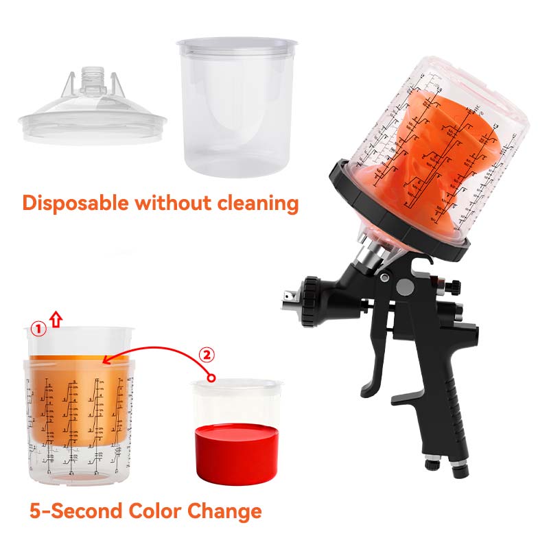దిపునర్వినియోగపరచలేని స్ప్రే గన్ కప్పు ఉపయోగం తర్వాత శుభ్రపరచడం అవసరం లేదు; త్వరగా రంగులు మార్చడానికి లోపలి కప్పును విస్మరించండి, రంగు మార్పు విరామాన్ని 20 నిమిషాల నుండి 5 సెకన్లకు తగ్గించి, రోజువారీ ఉత్పత్తిని సమర్థవంతంగా రెట్టింపు చేస్తుంది. మలినాలను ప్రభావవంతంగా ఫిల్టర్ చేయడానికి మూత అంతర్నిర్మిత ఫైన్ ఫిల్టర్ను కలిగి ఉంది, ఇది ఏకరీతి మరియు మృదువైన స్ప్రేని నిర్ధారిస్తుంది, ఫలితంగా అధిక-నాణ్యత ముగింపు ఉంటుంది.